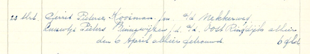 Trouw akte in het kerkboek uit de Beemster. Gerrit Kooiman woonde aan de Nekkerweg, en Luuwtje Biinenwijzen woonde aan de Oost-Ringdijk.
