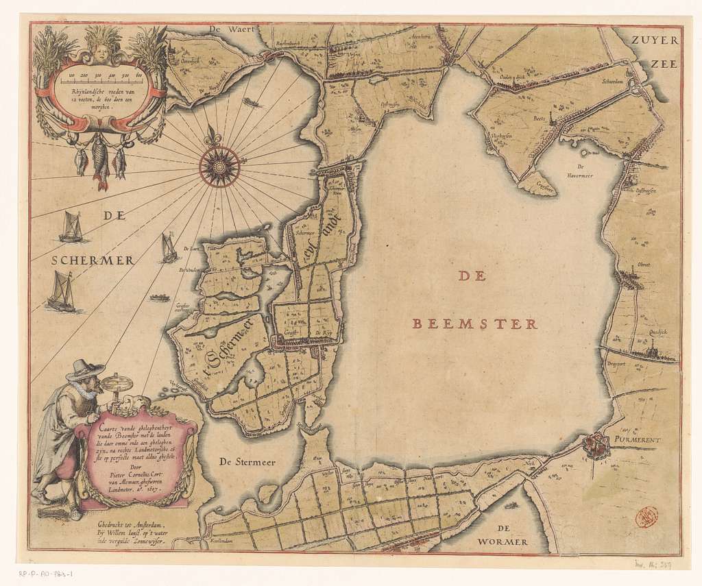 Kaart uit 1607. De Beemster (1612), de Wormer (1626) en Schermer (1633) zijn nog als meren te zien.
