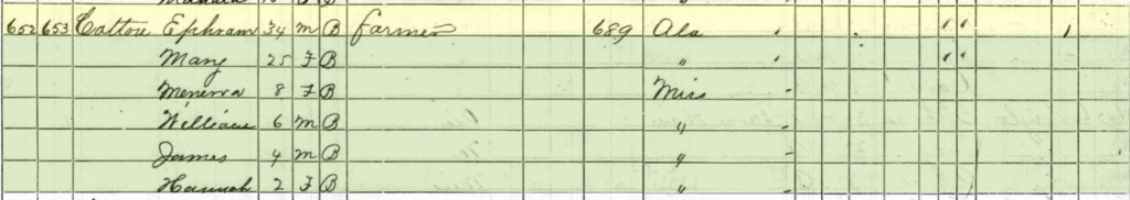 Ephraim and Mary were both born in Alabama, and all of their children were born in Mississippi. The neighbors of Ephraim and Mary in 1870 are a white farmer named Hannah Cotton (52 yrs old) and many black families that also went by the last name Cotton. It is likely that the black men and women in that township were the emancipated slaves of Hannah Cotton. Hannah and her son Walter (23 years old) own combined $8,500 worth of real estate (land) and the owners of the land farmed by the black families.