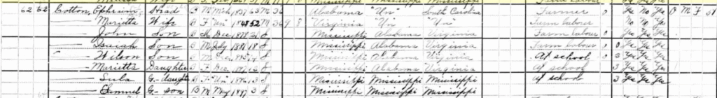 The 1900 census shows that Ephraim and his wife owned the farm they worked on. They still had a mortgage at this time, but they were not renting the farm. Ephraim was 63-years old at this time and was working the farm with his wife and his sons John Cotton and Isaiah Cotton who we 21 and 18 years old respectively. The family also had two grandchildren living with them: granddaughter Lula (13-years old) and grandson Samuel (3-years old). The records show that the eldest sons were literate and had learned to read and write. Children Wilson (14-years old) and Marietta (13-years old) and granddaughter Lula (13-years old) were all going to school.